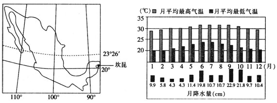 4、单选题 当地时间2010年11月29日,联合国气候变化会议开幕式在墨西哥坎昆举行。读坎昆所在地区示意图和坎昆气候资料图,回答1~2题。