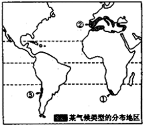 3、单选题 如图为“某种气候类型分布示意图”,读图完成问题。