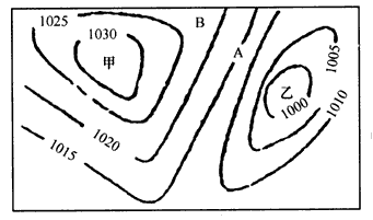 2、综合题  读“北半球某地区海平面等压线图”,回答下列问题。