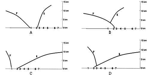 4、单选题 该天气系统在1—7处的剖面图正确的是