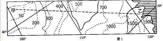 5、单选题 下面是某区域图中,点虚线是等年降水量线。读图1,回答7~8题。