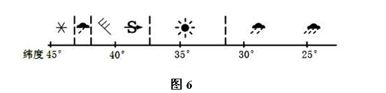 1、单选题 图6为某日中国东部一条经线附近地区的天气状况示意图,读图,该日最可能出现在