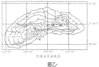 小题3:读图乙,根据等高线分布判断,钓鱼岛以山地为主,坡度陡,河流短小,淡水资源不足,A错。读图乙分析,岛上的地势北部较缓,南部陡,B错。钓鱼岛位于亚欧板块和太平洋板块之间,是消亡边界,C错。由题目可知,钓鱼岛位于我国的大陆架上,有沿岸寒流与台湾暖流相交汇,渔业资源丰富,D对。