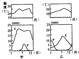 5、单选题 读下面甲、乙两地年气温分布与土壤水分收支状况图(P为降水量,E为蒸发量),回答1—2题。