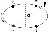 小题2:本地球从甲处经乙、丙、丁回到甲公转一周(甲、乙、丙、丁之间等距)四段之间用时最少的是?(?)