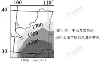 (3)描述下图所示地区太阳年辐射总量分布规律并分析其主要原因。(4分)