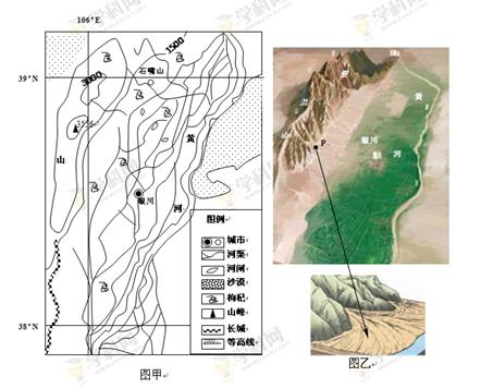 年降水量仅200mm左右但蒸发量达1600mm的银川平原,因黄河贯穿,湖泊众多,加之贺兰山的“守护”,盛产稻米、枸杞等名特优产品,有着“塞上江南”的美誉。图甲为银川平原及周边区域图,图乙为该区域地貌景观示意图。
