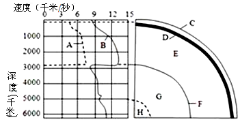 (3)F界面处,A地震波 ,B速度变化 。这说明F界面以上物质状态为 态,以下为 态。(4分)