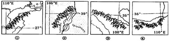 (1)根据经纬度和山脉走向可以进行空间定位,①山脉是雪峰山,是我国二三阶梯分界线,②是贺兰山我国季风区和非季风区的分界线,③是巴颜喀拉山不是我国地势一、二级阶梯的分界线,长江与黄河的分水岭,④是秦岭,是我国800毫米等年降水量线通过的地方。