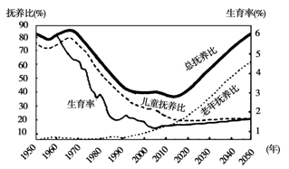 5、单选题 生育率是指不同时期、不同地区妇女或育龄妇女的实际生育水平或生育子女的数量;抚养比是指在人口中,非劳动年龄人口与劳动年龄人口之比。读“韩国生育率和抚养比示意图(含预测)”,回答下列各题。
