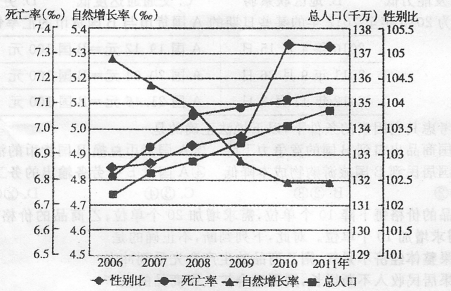 4、单选题 下图是我国人口相关数据统计冒。出生人口性别比为每出生100名女婴相对应的出生男婴数。读图,回答下题。