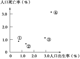 1.读出四地的人口出生率、死亡率并计算人口自然增长率即可。④地的人口出生率约3.4%,人口死亡率约3.1%,故自然增长率约0.3%,符合。