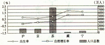 1.死亡率=出生率-自然增长率,读图可知人口死亡率最高的是上海,最低的是宁夏;每年净增加人口数=人口总数×自然增长率。结合图中数据可大致估算出江苏每年净增人口最多,西藏最少。