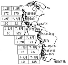 4、单选题 图为美洲大陆略图,图中是西海岸部分地区1、2月和7、8月降水(单位:mm)资料。读图回答下面2题。