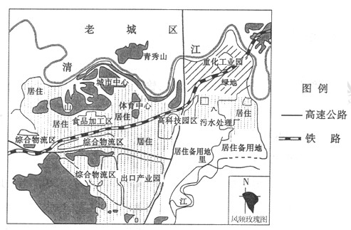 (1)由图中的布局来看,这些重工业有合理的地方,也有一些不合理的地方,如果我们从不同侧面来分析,合理就可以。如它分布在铁路、河流附近,不单单交通便利,便于原料运进、产品的运出,还有充足的水源,此外它还是分布在河流的下游,不会污染城市的水源。但是由图中的玫瑰风向图知道,当地主导风向是东南风或偏东风,而重化工业区正好位于这个方向上,会对城区带来污染,对城区不利。