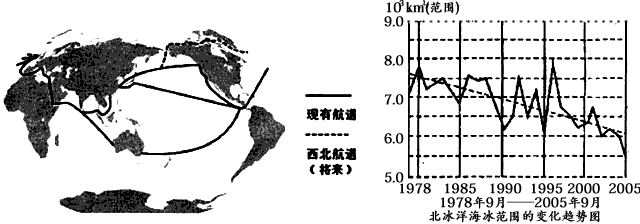 5、单选题 ? 西北通道是指从北大西洋经加拿大北极群岛进入北冰洋,再进入太平洋的航道。以往因受冰封影响,航运有限,但依2007年的观测,西北通道有望未来实现通航。结合图回答1—2题。