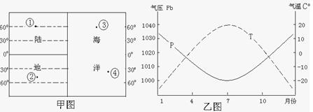 5、单选题 读图海陆分布示意图(甲)和某地气压、气温年变化示意图(乙),据此完成第下列各题。