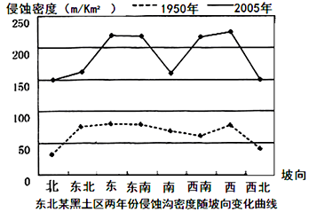 【小题1】由图可以看出:1950年东北、东、东南和西侵蚀沟密度大,北、西北小;2005年东、东南、西、西南侵蚀沟密度大,北、西北、南小;综合1950年和2005年,侵蚀沟密度西南坡小于东南坡,A错;东南坡大于西北坡,选B正确;南北坡小于东西坡,C错;西北坡小于东北坡,D错。