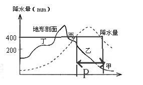 【小题1】如下图所示,降水量曲线和地形剖面共一个横坐标,过400mm作横坐标平行线与降水量曲线相交,过两交点作横坐标垂线,P范围内的山坡段降水在400mm以上。所以森林景观出现在乙。故选B。