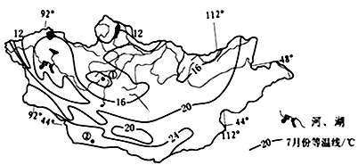 4、单选题 图示为亚洲某内陆国水系分布和七月份气温分布情况。读图完成下题。