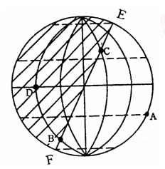 (1)按自西向东过图中EF线,由黑夜进入白天,故此线为晨线。