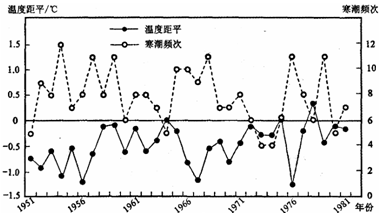 2、单选题 图示意中国1951——1981年地表温度距平与寒潮频次的变化。读图完成下列各题。