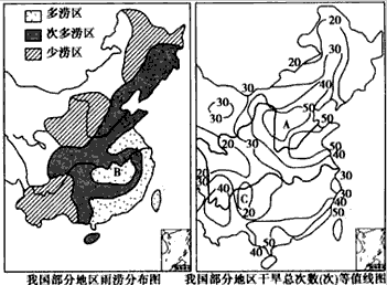 2、综合题 读“我国部分地区雨涝分布图”和“我国部分地区干旱总次数(次)等值线图”,回答下列问题。