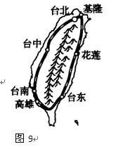 5、单选题  材料:台湾岛多火山、地震。岛上的河流虽短,但水流湍急,水能蕴藏量大。台湾的东部是高大的台湾山脉,最高峰玉山的海拨高达3997米。读图9,完成问题