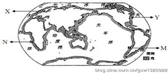 小题1:M处位于板块交界处,地壳运动活跃,故多海底地震或火山喷发,而引起海啸。小题2:南美大陆西侧是南极洲板块与美洲板块直接消亡边界,海沟紧挨南美大陆,所以就很可能形成没有宽阔的大陆架的直接大陆坡。