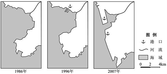 2、综合题 图示意我国南方某滨海城市局部海岸的变迁,读图回答问题。