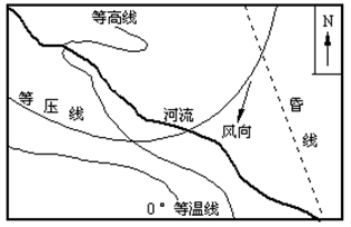 5、单选题 读“中纬度某地某日河流、风向、等压线、等高线、等温线、昏线的组合图(下图)”,完成下列问题。