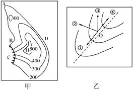 24.若乙图为甲图中某地等高线的一部分,实线为等高线(单位:米),虚线为泥石流路线,某游客此时正好位于O点,则其正确的逃生路线是图中①~④中的哪一条路线(?)