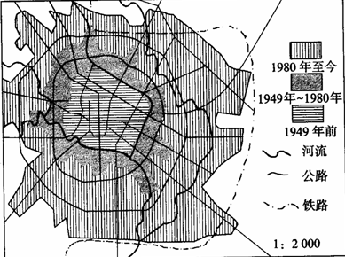 5、单选题 下图为我国东部地区某城市形态变化示意图,据图回答下题。