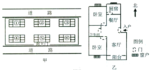 1、单选题 某开发商分别在北京(约40°N)和福州(约26°N)开发了两个楼盘。两地各有朝向和楼高相同的户型结构如(乙图)所示。读图回答下列小题。