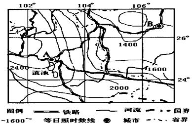 (1)图中A城市与B城市日照数相差约为 (小时),(2分)
