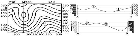 【小题2】观察交点在两条剖面线上的位置,如在MN上,交点位于两个山顶之间,为海拔的相对低的点,即点3位置。在XY上,交点位于两侧山谷的中间位置,为海拔相对高的点,即点2位置。故D正确。