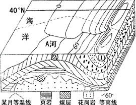 小题1:本题考查世界主要气候类型的分布及判断。图中纬度为40°N,A河位于大陆西岸30°-40°之间,所以A流域为地中海气候,地中海气候雨热不同期。根据图中陆地等温线向北凸出,陆地气温较高,为北半球夏季,北半球地中海气候区受副热带高压控制,降水稀少,所以正值枯水期;地中海气候对应的陆地自然带为亚热带常绿阔叶林带。所以本题选择C选项。