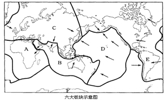 2、综合题  读“六大板块示意图”,完成下列问题(8分)