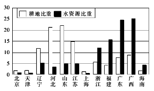5、多选题 下图为“中国沿海省区耕地、水资源对比图”,读图分析回答1—2题。