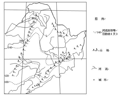 (2)由图中河流封冻等值线可以判断,甲大于180天(或大于180,小于200天),乙小于140天(或小于140,大于120天)。原因是地势较低,又有山地阻挡,受冬季风影响较小,气温较高。
