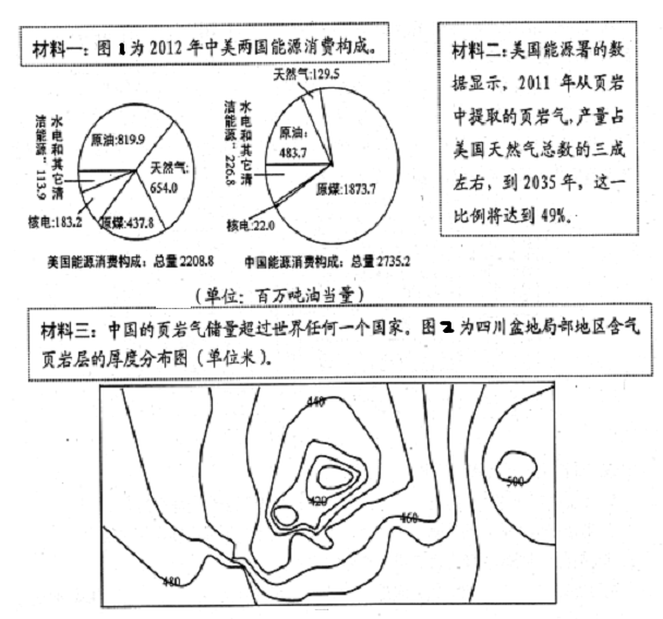 (2)结合材料和所学知识分析美国加大页岩气开采的原因,并推测页岩气开采对美国未来一段日期内能源消费结构带来的变化。(12分)