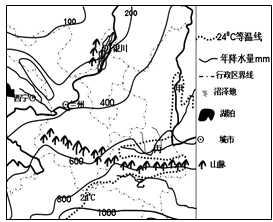 (1)我国气温总体上自南向北递减,甲位于黄河晋陕大峡谷内,地势较两侧低,气温比两侧高,导致甲地等温线向北弯曲。从图中年降水量数值分布可知:降水量自东南向西北递减;原因是我国夏季风自东南向西北推进,越向西北深入,力量越弱,降水越少。
