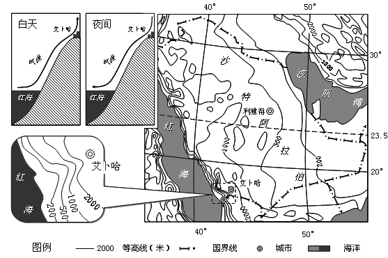 (2)艾卜哈是沙特阿拉伯难得的避暑胜地,要从艾卜哈气温相对较低、降水相对较多来分析。由图可知艾卜哈西侧是红海,离海较近,升温较慢;而图中艾卜哈等高线的值大于2000米,故该地海拔较高,气温较低;图中还给出了艾卜哈的热力环流,由图可知:白天山坡上气温高,红海蒸发的水汽沿山坡上升,容易形成云雨天气,这样削弱了太阳辐射,气温较低;夜间山坡降温快,气流下沉,艾卜哈上空水汽减少,大气逆辐射弱,降温快,气温较低。