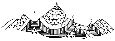 (1)背斜岩层向上隆起,向斜岩层向下弯曲。所以,图中A、B、C、D四处,属于背斜的是A,属于向斜的是B。