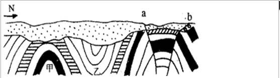 (1)图中字母表示的地质构造是:甲_______;a、b_______。