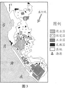 小题1:从图中可以看出,该城市商业区集中,但并不会缩小其服务范围;住宅区虽远离海洋,但工业区却沿海分布,更容易造成海洋污染;文教区分散布局,接近各处住宅区,可以更好地为周围居民服务;工业区相对集中在城市的东南部,方便企业联系。选项C符合题意。