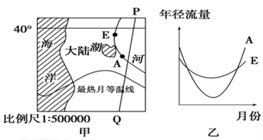 2、单选题 下面甲图中PQ为晨昏线的一部分,图示陆地地势较为平坦;乙图中的年径流量曲线是从甲图中A、E两处测得的。读图回答各题。