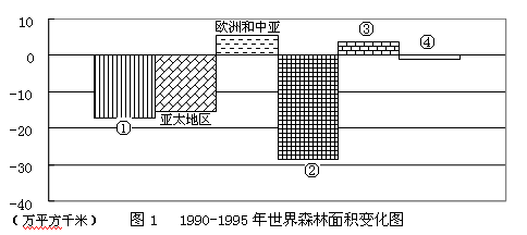 1.图中①、②、③、④代表的地区分别是2.下列关于①、②、③、④四地森林面积变化及原因的分析,正确的是