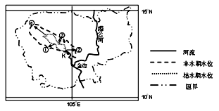 【小题2】金边至K河段位于热带季风气候区,夏季降水多,冬季降水少,该河段主要靠雨水补给,所以8月水量大2月水量小;金边至K河段地处中南半岛地势北高南低,河流自北向南流,K河汇入湄公河流入南海。故选C。