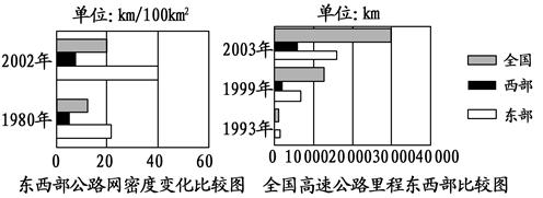 2、单选题 读“东西部公路网密度变化比较图”和“全国高速公路里程东西部比较图”,下列说法正确的是( )